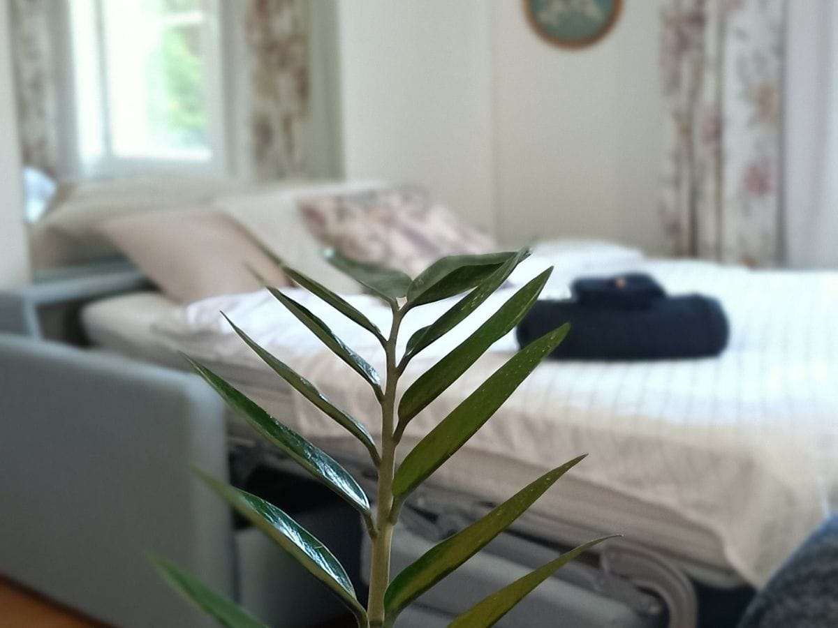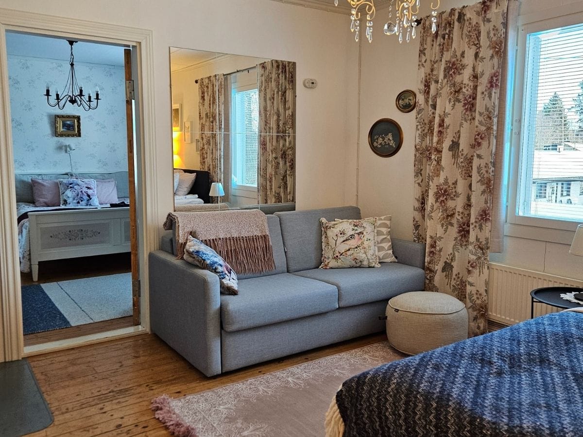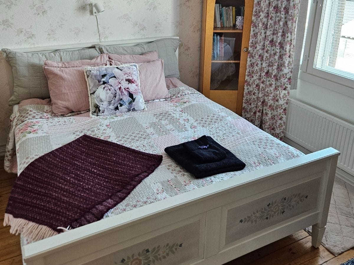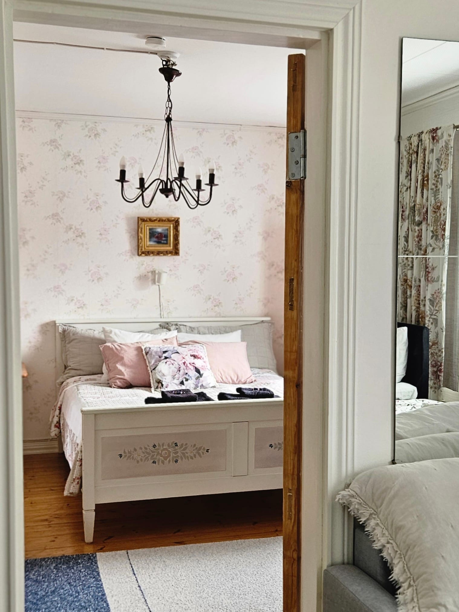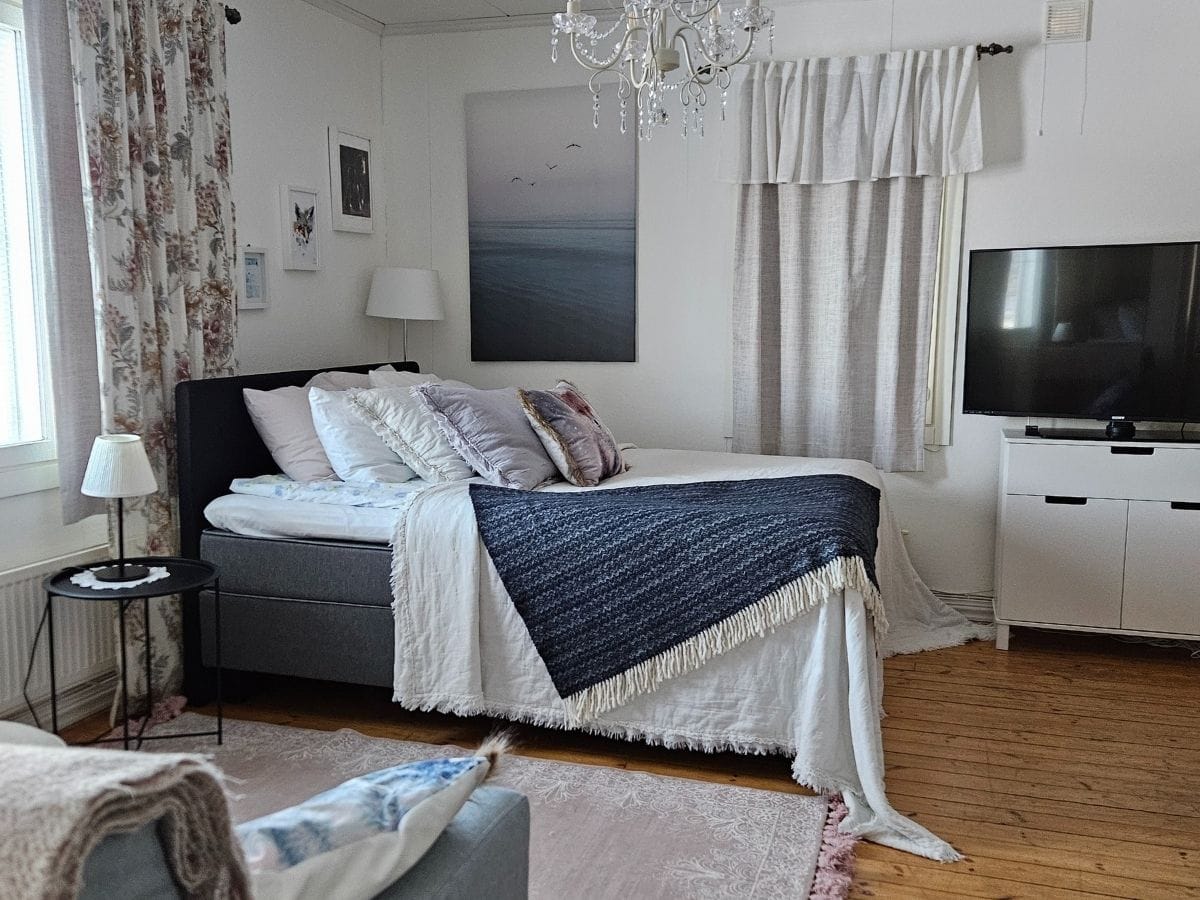 Ruusuinen parivuode on huoneiston pehmein ja lisäksi huoneessa on lattiatilaa vaikkapa pienelle joogatuokiolle. Joogamatot löydät sinisen huoneen lipastosta. Jos teillä on mukava pieniä perheenjäseniä, saamme tähän huoneeseen helposti kauniin puisen vauvansängyn tai jos olet menossa vaikka konserttiin, mahtuu tänne myös silityslauta.