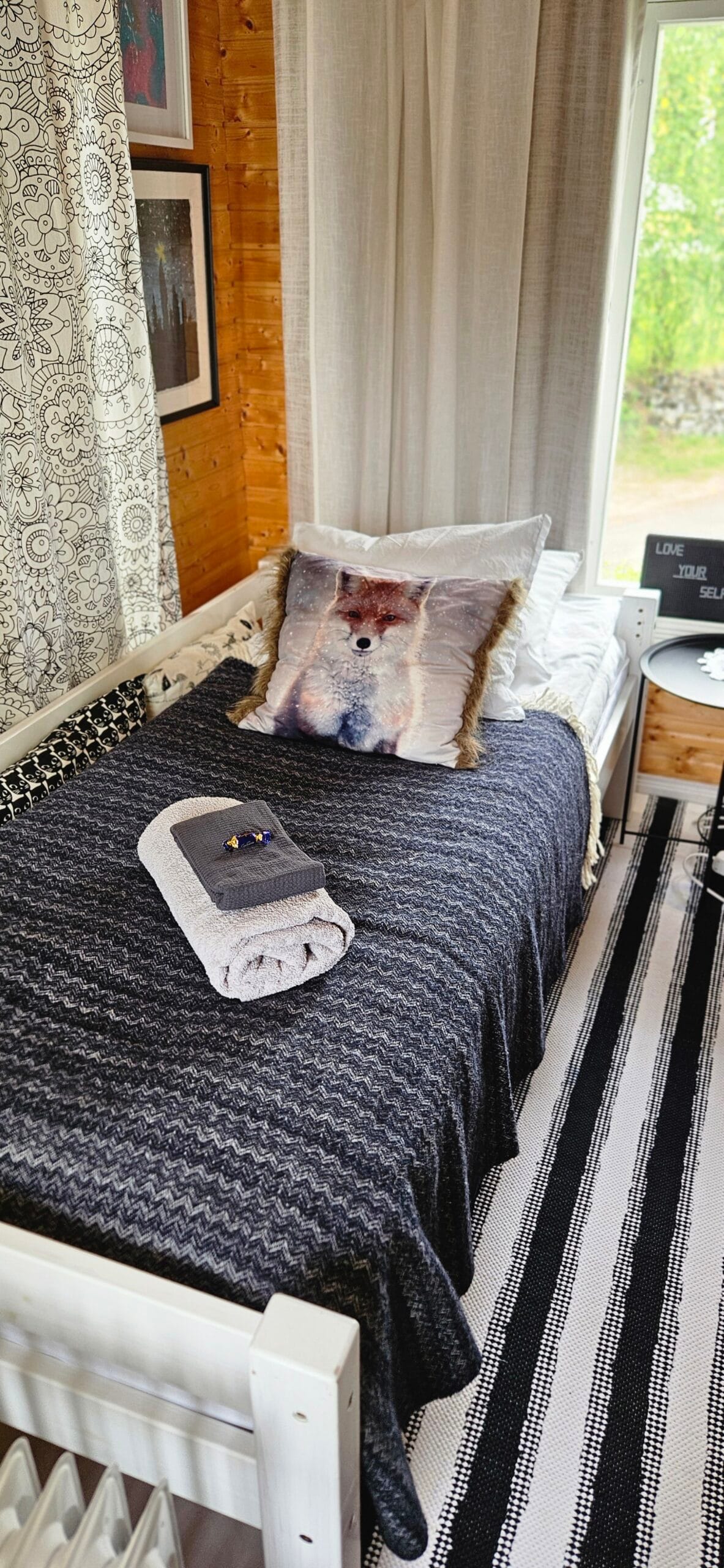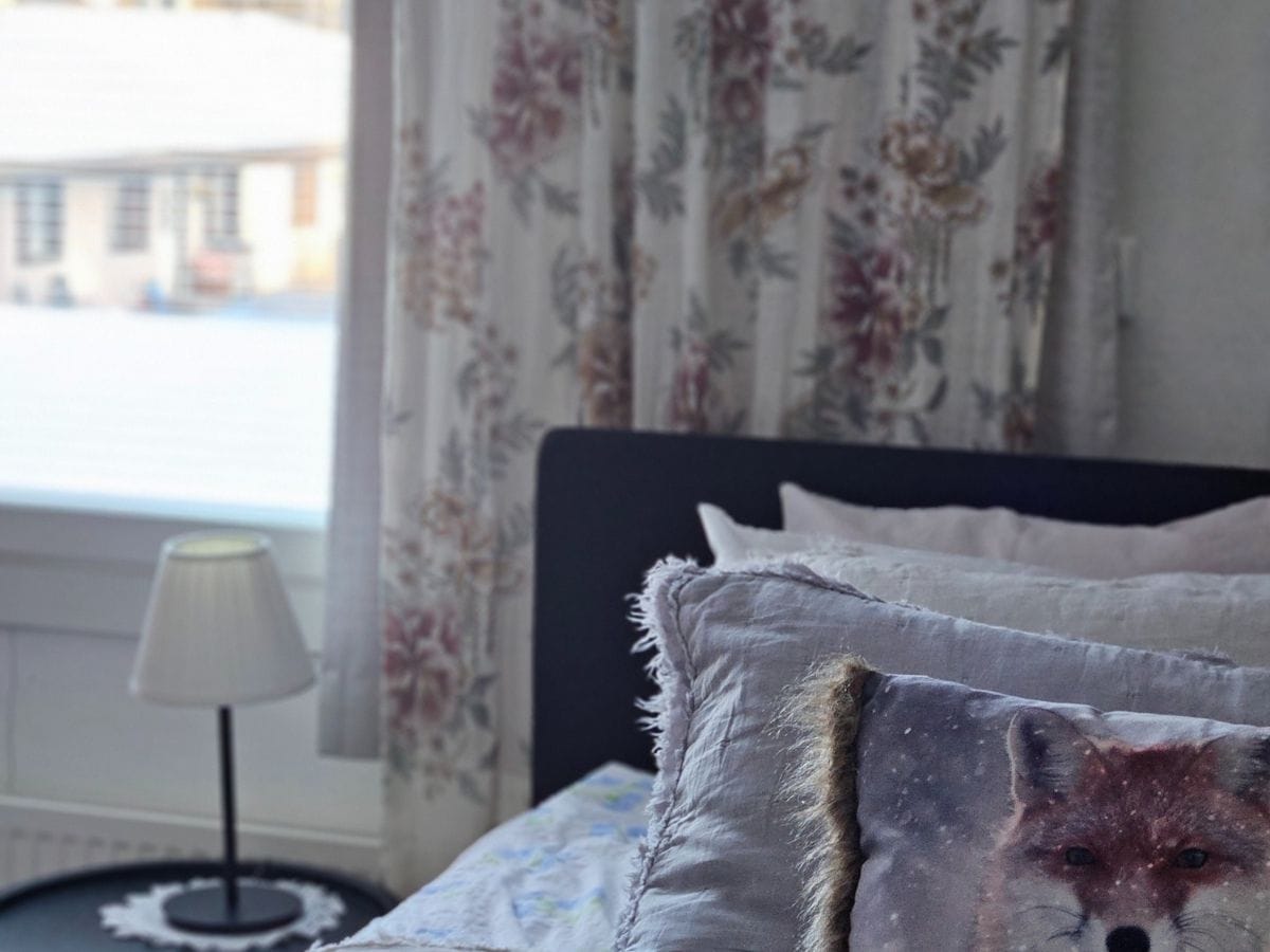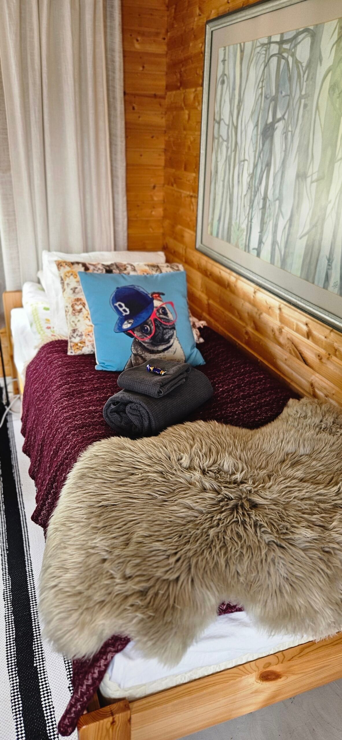 Lähtökohtaisesti petaamme kesällä viileän peiton ja talvisin paksun lämpöpeiton. Lisäksi on tarjolla lisävilttejä ja villasukat sekä useita erilaisia pienempiä tyynyjä mukavan oleskeluasennon varmistamiseksi.