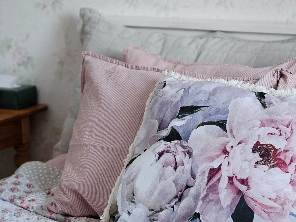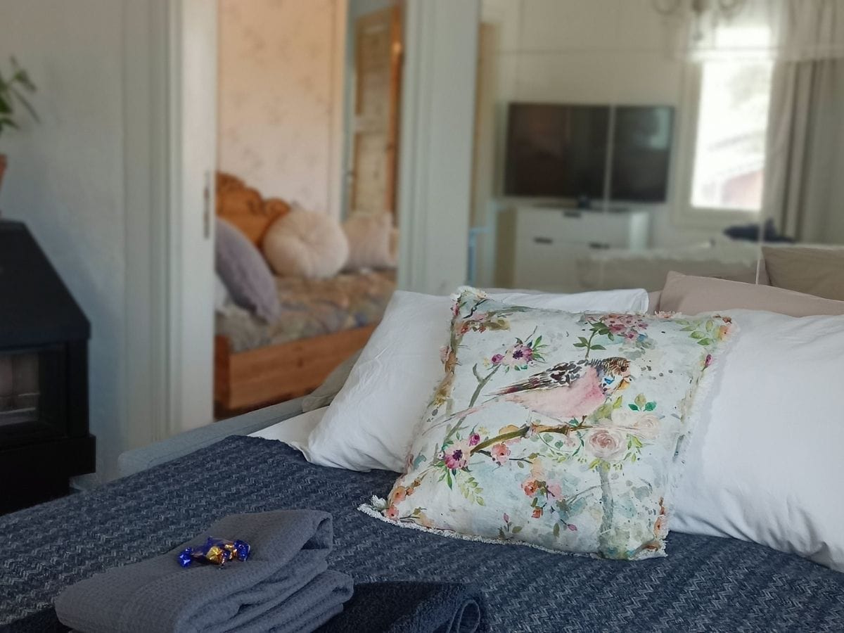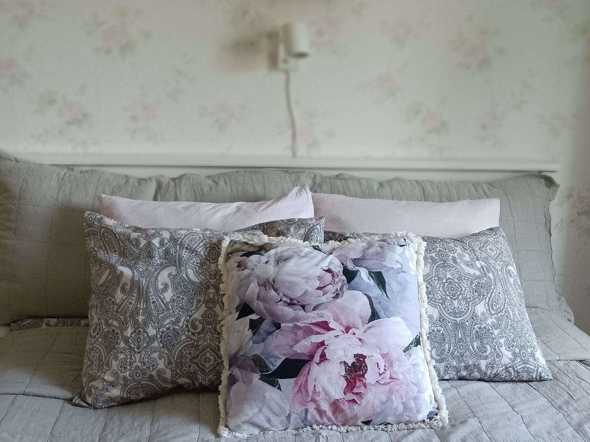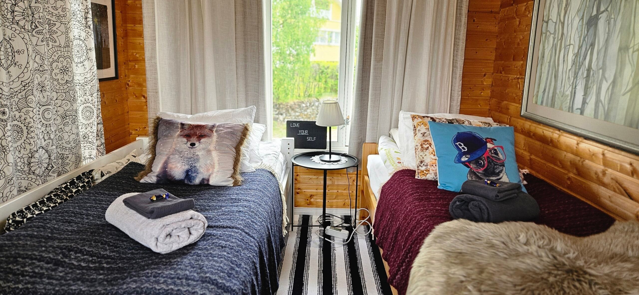 Lähtökohtaisesti petaamme kesällä viileän peiton ja talvisin paksun lämpöpeiton. Lisäksi on tarjolla lisävilttejä ja villasukat sekä useita erilaisia pienempiä tyynyjä mukavan oleskeluasennon varmistamiseksi.