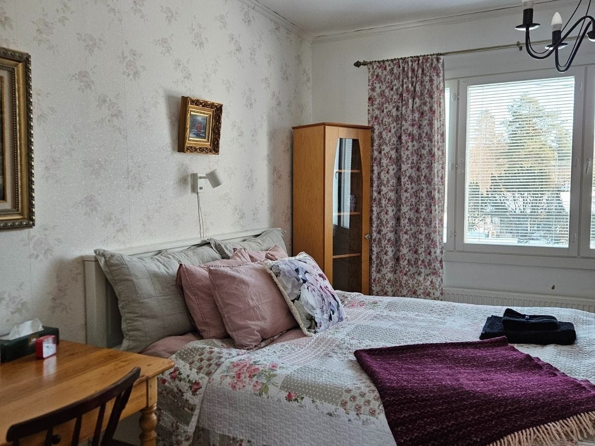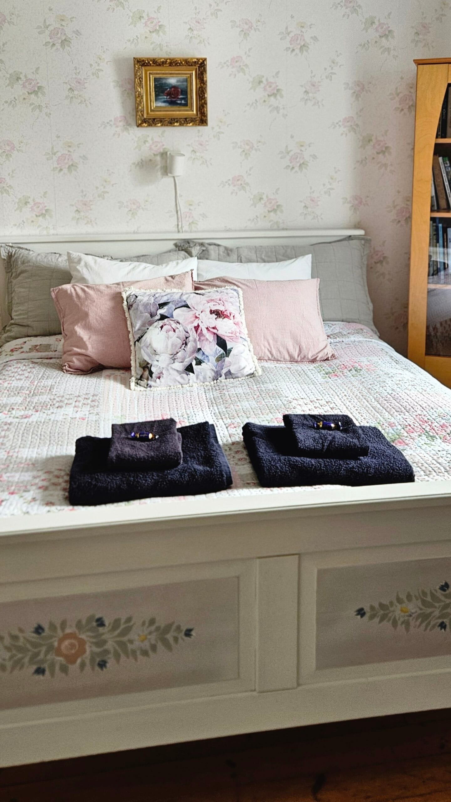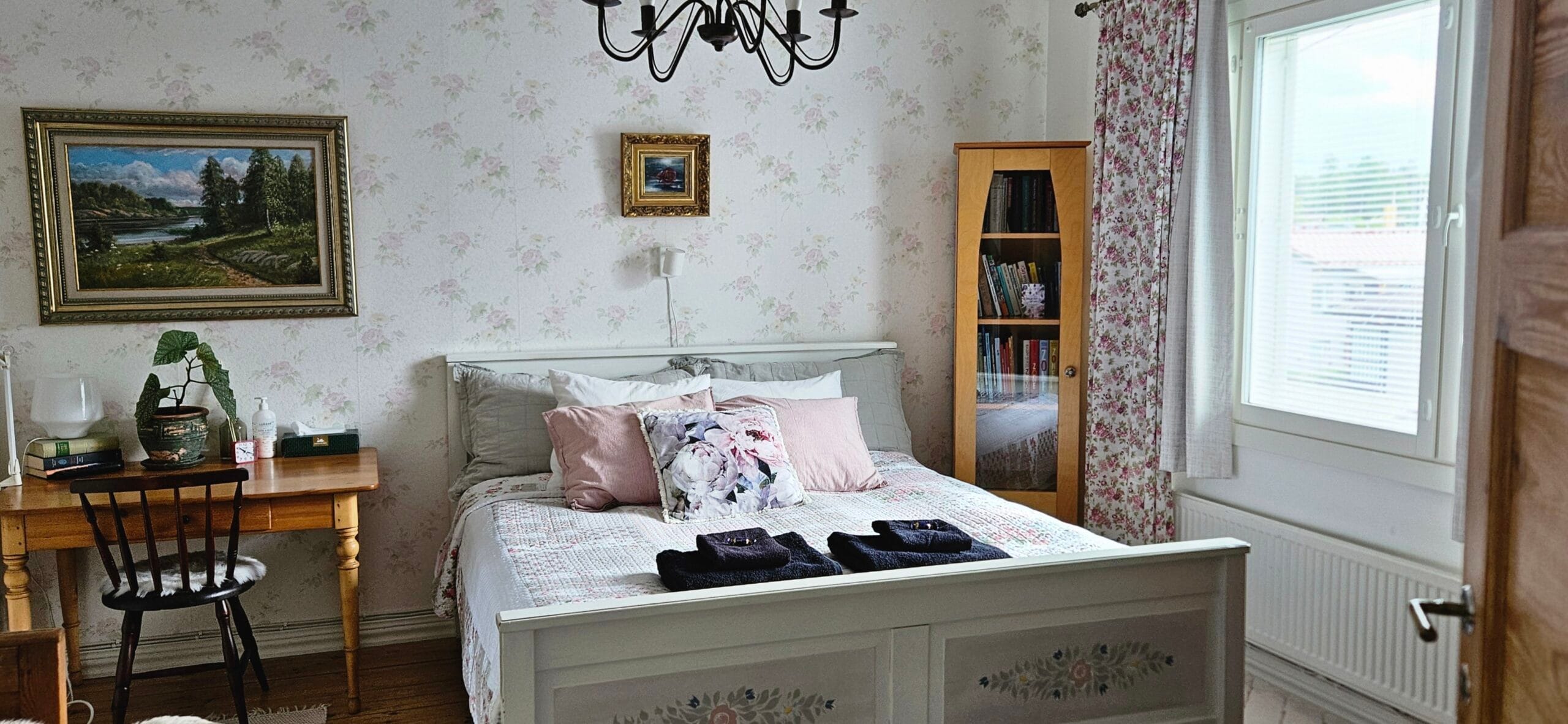 Ruusuhuoneen pienessä kulmapöydässä on työpöytävalo, jos innostut vaikka kirjoittamaan päiväkirjaa tai piirtämään jotakin! Paperia, kyniä ja tusseja löydät keittiön kaapista. Inspiraatioksi on luettavaa kirjakaapissa. Molempien sänkyjen päädyissä on käännettävä lukuvalo.