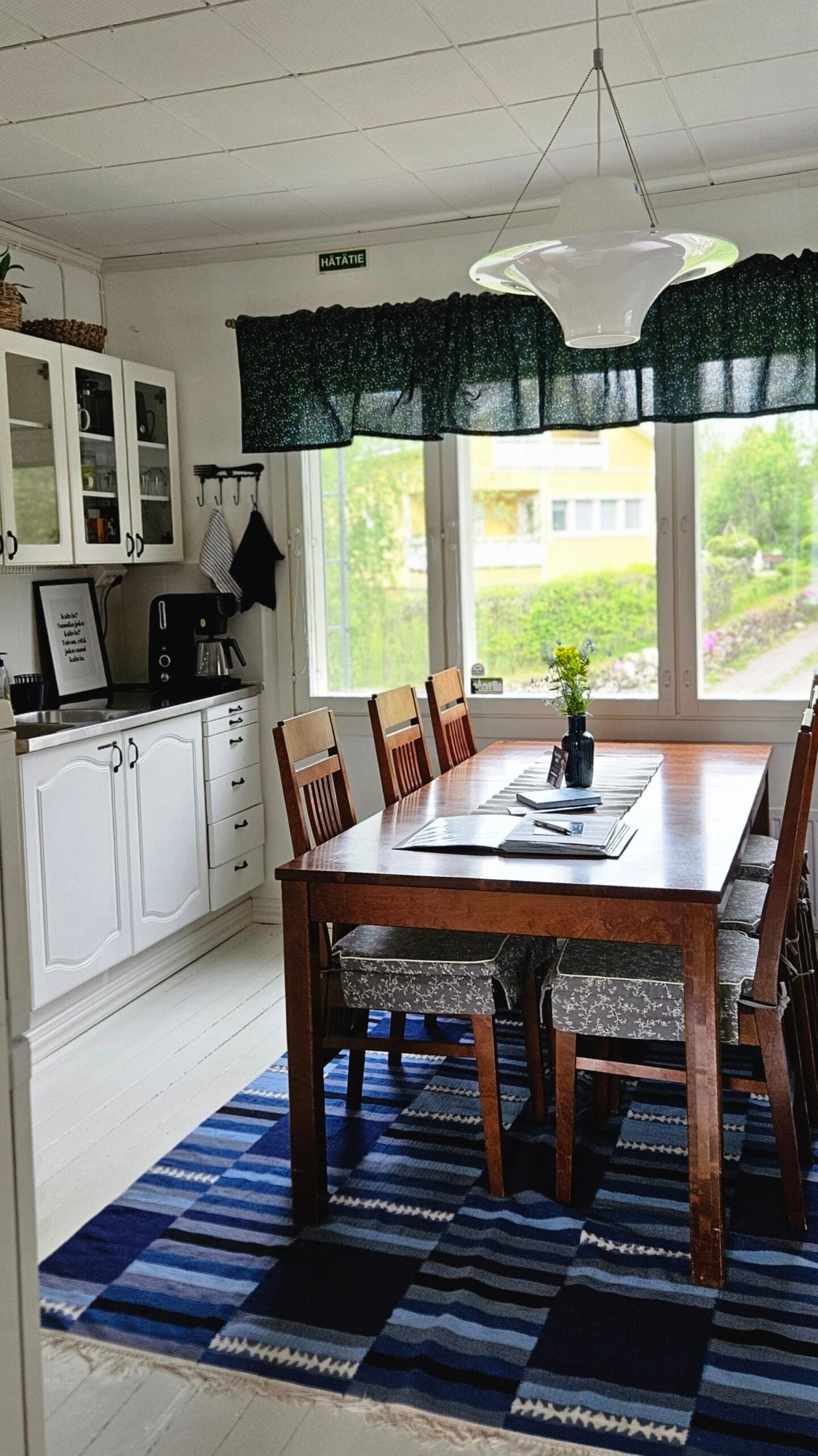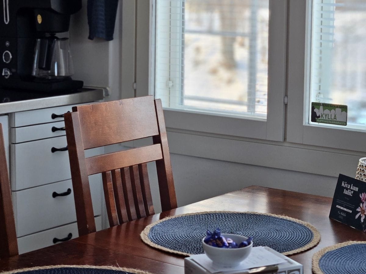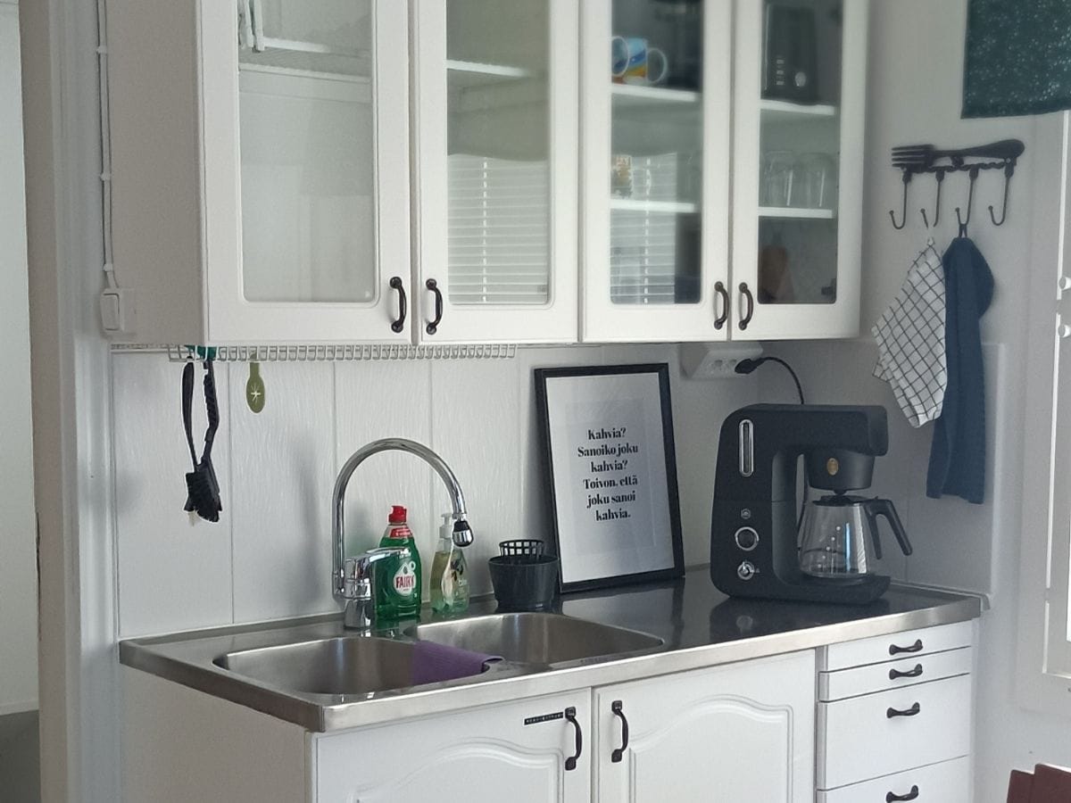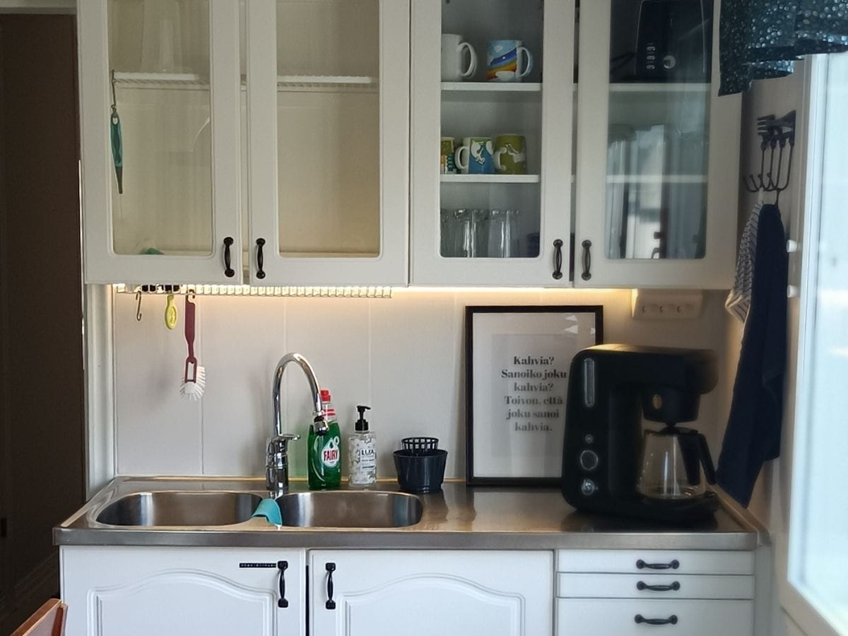 Pienten lasten kanssa tarkkana! Keittiön vetolaatikoissa ei ole estoa ja astiakaapit saa halutessaan auki. Jos jotain puuttuu, niin kysy alakerrasta lisää lainaan. Saatavilla mm. vohvelirauta ja lämpimien leipien rauta. Lapsille on saatavilla syöttötuoli ja sitteri. Ne ovat yleensä ulkoeteisessä säilytyksessä, niin eivät vie keittiöstä tilaa. Kunhan tiedämme lapsivieraista, niin tuomme nekin valmiiksi keittiöön.