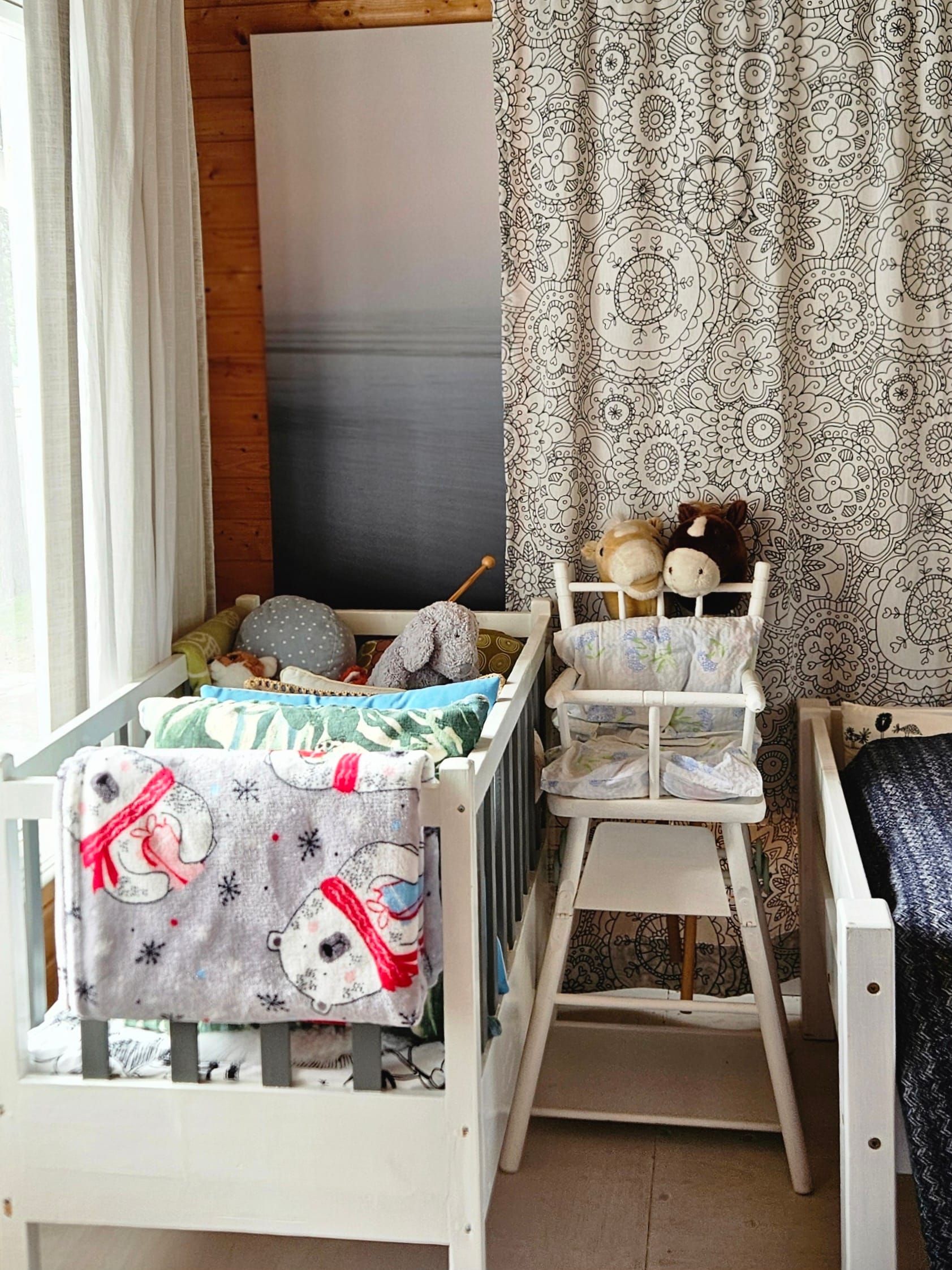 Huonetta ei pimennysverhoista huolimatta saa ”säkkipimeäksi”, sillä verhot ovat verhotangoissa.