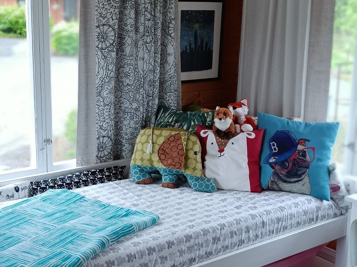 Petauksissa käytämme vain 100% puuvillaisia vuodevaatteita ja aina on tarjolla kaksi eripaksuista tyynyä jokaiselle nukkujalle. Tämän huoneen vaatekaapissa on lisäksi itse säädettävä täyttötyyny ja viileän pinnan omaava tyyny, jos olet helposti hikoilevaa tyyppiä.